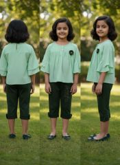 Girl's Mint Green Ruffle-Sleeve Tunic and Dark Green Capri Pants Set