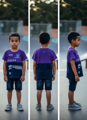 Boy's Purple and Navy Color-Block Graphic T-Shirt and Dark Denim Shorts Set.