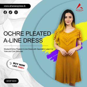 Mustard/Ochre Pleated A-Line Dress with Geometric Laser-Cut Yoke and Cold Shoulder