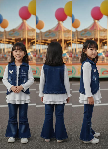 Girl's Layered Denim Bell Bottoms and Embroidered Vest Set